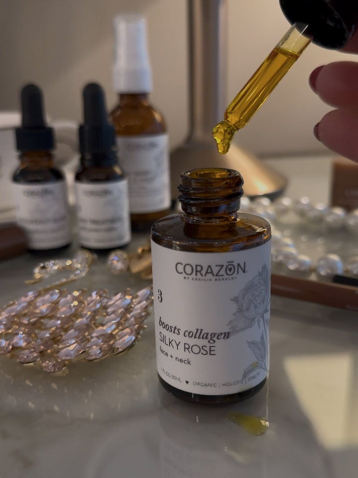 At Corazón Organic Beauty, we infuse this exquisite essence into several of our holistic products, including our Silky Rose Elixir and Rose Face Mist, honoring its tradition of nourishment and transformation. Bulgarian Rose Otto is not merely a fragrance—it’s a full-spectrum skin remedy that hydrates, soothes, brightens, and rejuvenates from deep within the skin.